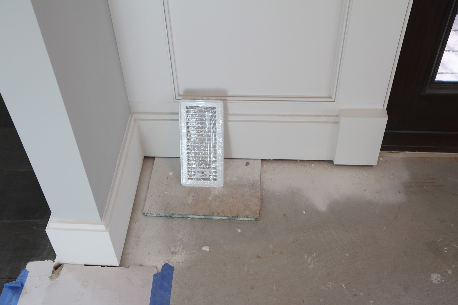 The wood vents were installed on the first floor in all the floor vent locations. We've had these stashed away somewhere, but they were in the raw wood form. Now they're stained to match the wood floor color and secured in place. The first floor is the only level with in-floor vents since the second floor and basement have in ceiling ducts. The vents don't seem to impede the air flow much and they're not closeable, which isn't a good idea anyways.